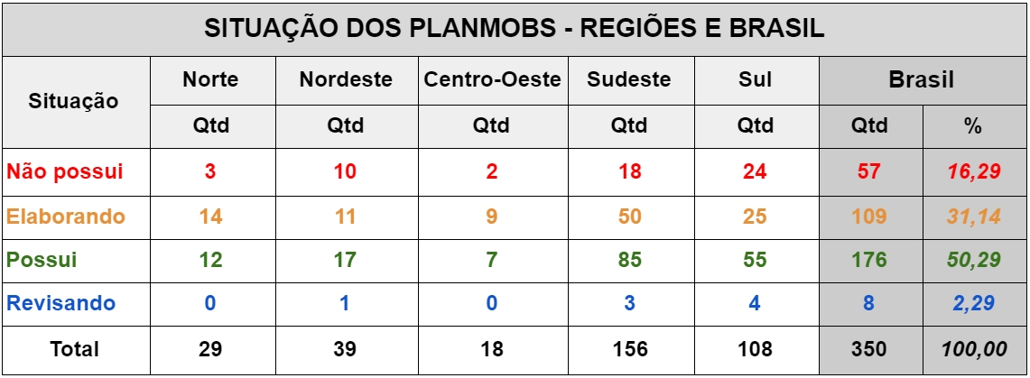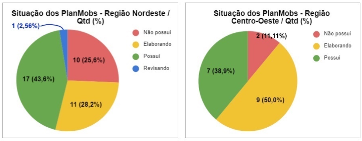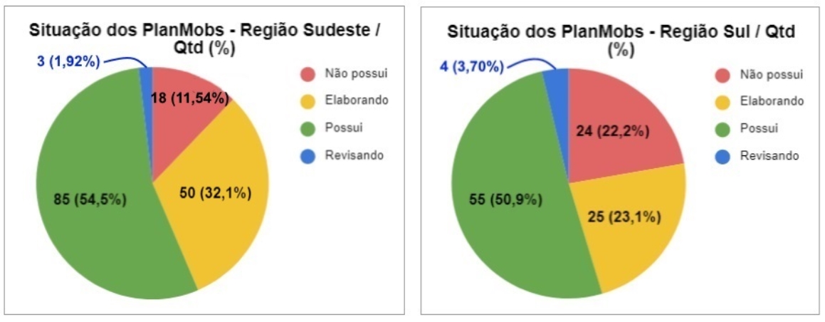 - A região brasileira com mais PlanMobs coletados no banco de dados é a região sudeste, com 54,49%, e a região menos provida é a Nordeste, com 25,64%. Na região Centro-Oeste, 50% das cidades estão elaborando seus PlanMobs e na região Sul 3,70% das cidades estão revisando o PlanMob vigente.