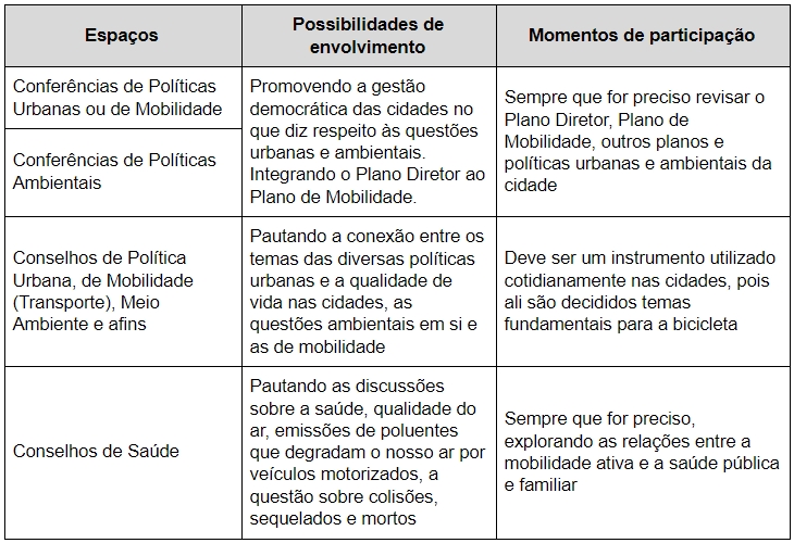 Abaixo, elencamos algumas possibilidades espaços institucionais onde podem acontecer relevantes discussões sobre a mobilidade ativa em seu município.