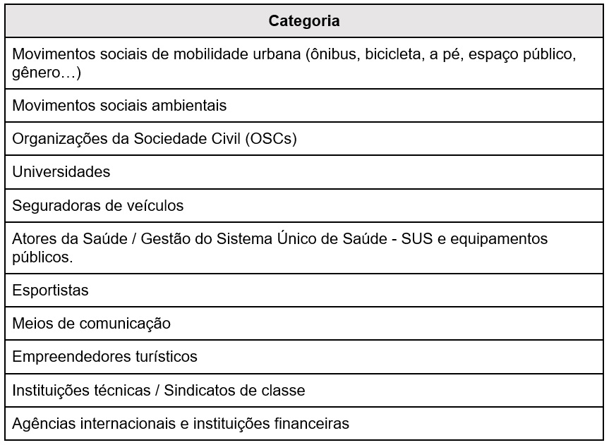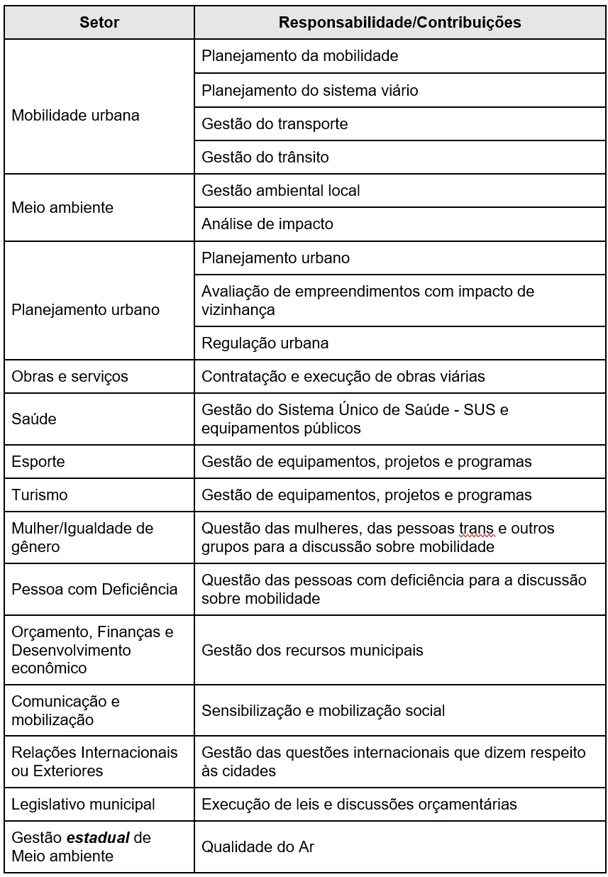 Abaixo, apresentamos os principais setores públicos municipais envolvidos na gestão da mobilidade e que podem contribuir para definição da visão. Sabemos que nem toda cidade têm divisões institucionais como as apresentadas abaixo, mas a ideia é lhes apresentar possibilidades e vocês fazem as adaptações ao arranjo institucional local. Para ver o quadro abaixo de maneira completa, visite a Orientação Técnica “Apoios e parcerias – 1) Porque e como buscar: o Mapa de Atores favoráveis e desfavoráveis“.