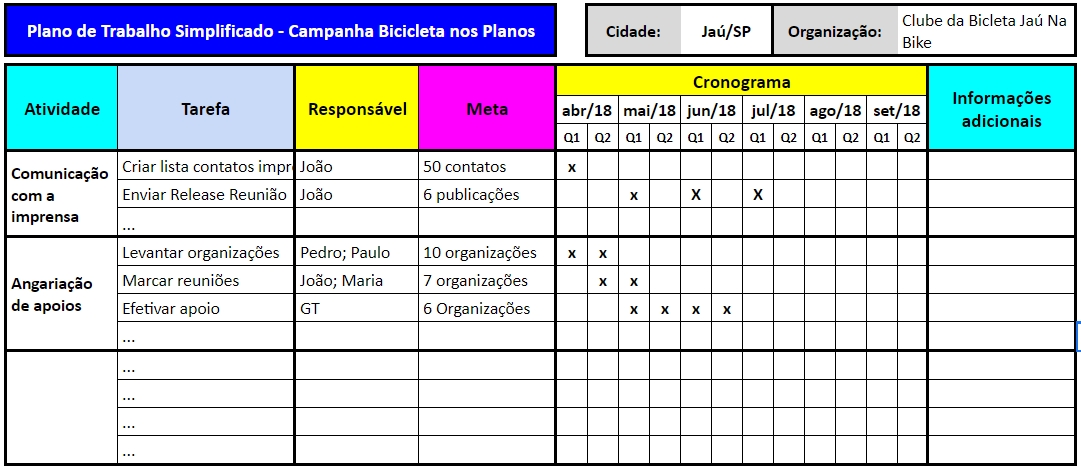 No caso da Campanha Bicicleta nos Planos, o objetivo geral já está definido: incluir a bicicleta na cidade através do Plano de Mobilidade – PlanMob. O Plano de Trabalho poderá contribuir para os membros da Organização Local (OL) identificarem as táticas a serem usadas para alcançar o objetivo.