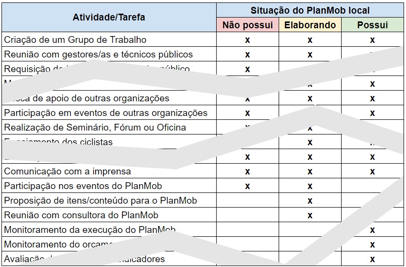 Na tabela abaixo segue um extrato simplificado demonstrando algumas atividades recomendadas de acordo com a situação do PlanMob local.
