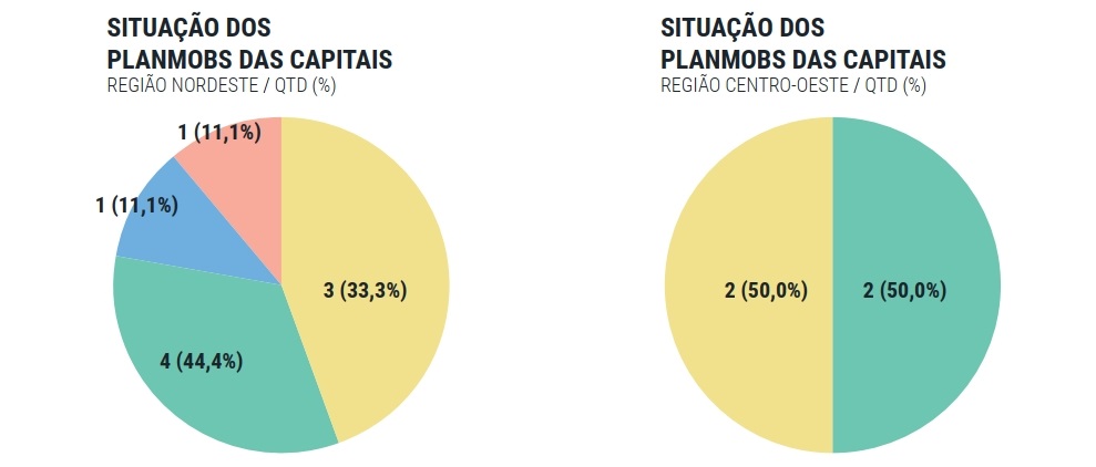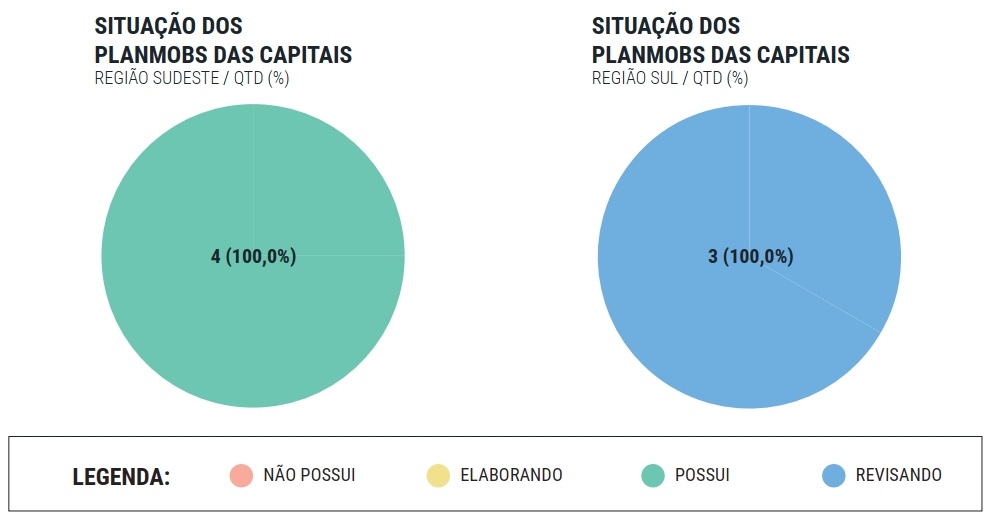 • Dentre as capitais, as regiões com mais PlanMobs vigentes são a Sudeste e a Sul, ambas com 100%. Apenas Maceió, capital de Alagoas, na região Nordeste, não possui PlanMob;