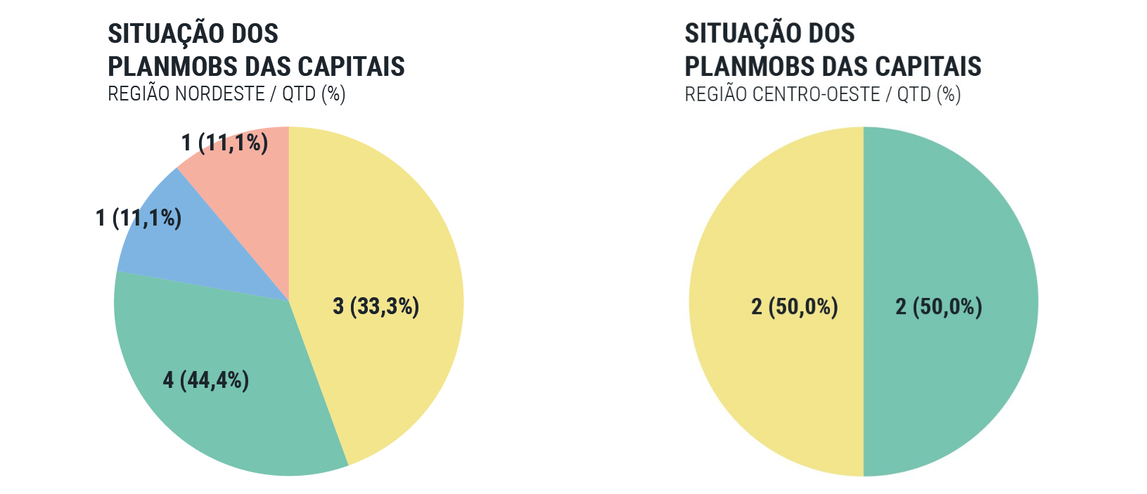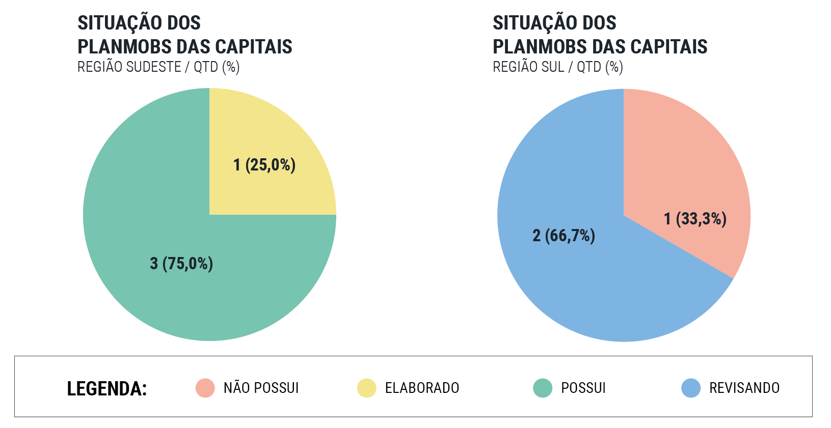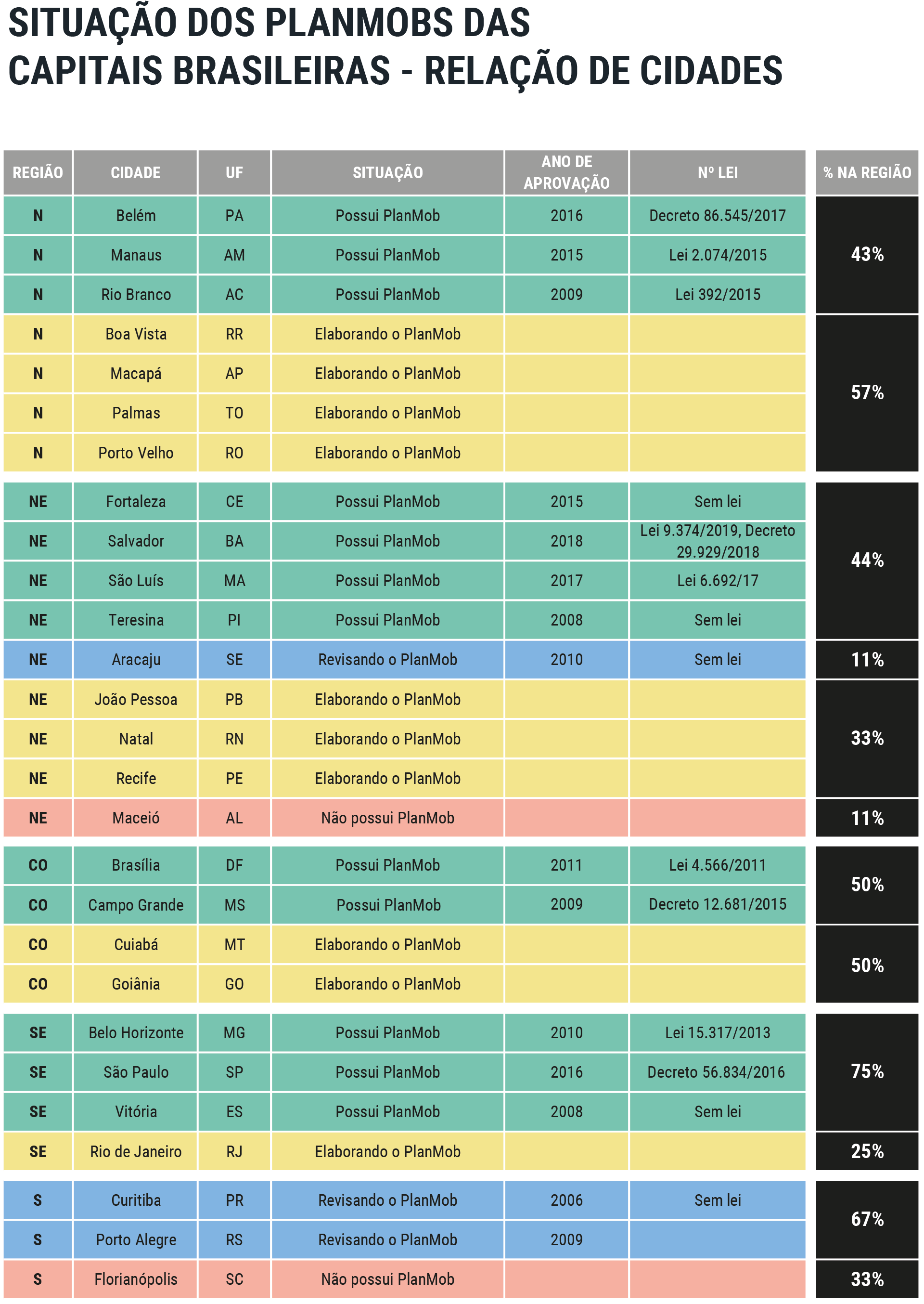 - Dentre as capitais, a região com mais PlanMobs vigentes é a Sudeste (75%) e a região com menos PlanMobs vigentes é a Sul (33%). Apenas duas capitais ainda não começaram a elaborar seus PlanMobs: Florianópolis (região Sul) e Maceió (região Nordeste). Em todas as demais regiões, os PlanMobs das capitais estão sendo elaborados, vigentes ou em revisão;