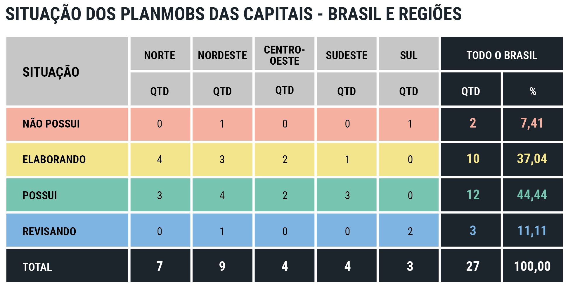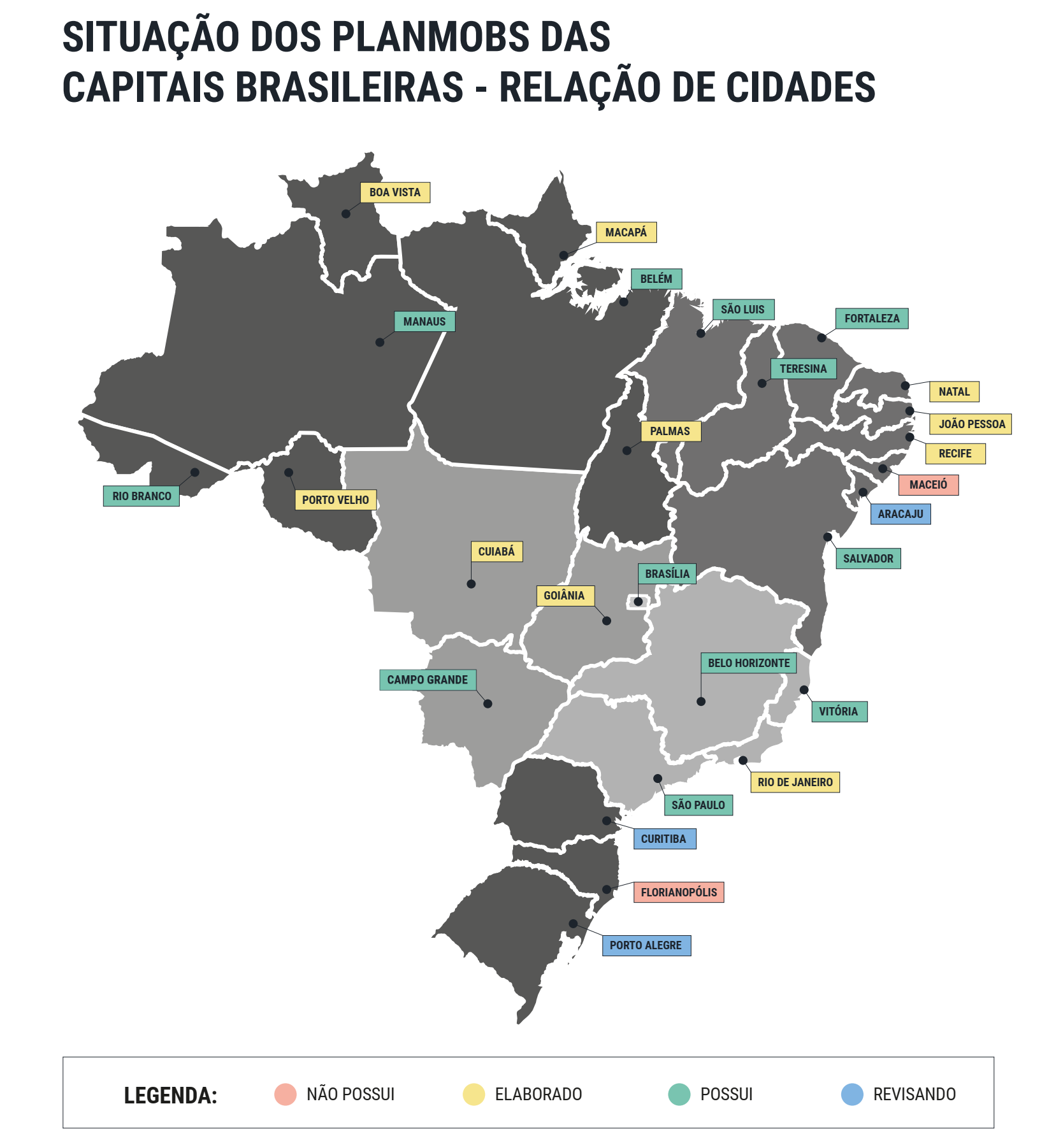 - O fato de apenas 2 capitais brasileiras não possuírem nem terem iniciado a elaboração do PlanMob demonstra que esta é uma agenda necessária e sem volta nos centros urbanos;